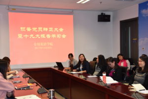 最后,各位老师和学生党员借此契机进行了热烈的互动。赵飞飞老师谈到和儿子的对话,阐释自己对为什么要入党的理解;修晨老师从她身边一位优秀老党员的事迹出发,分享了忘掉“小我”的私欲,多去帮助别人,从而获得更多快乐的自我修行过程;张东英老师分享了在学术文献阅读中对思想提升的理解;贾杰谈到了与学生对话中为学生答疑解惑的感受,分享了如何帮助学生平衡兴趣爱好、特长、福利待遇等找到职业发展方向等问题;张淑艳老师分享了如何将专业学习和思想理论学习结合的方法;周雪颖老师分享了对“不忘初心”中的“初心”的理解;王红欣老师分享了从英雄人物的事迹中得到的精神启迪。会议在热烈的掌声中结束。