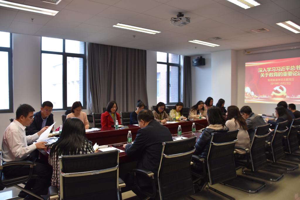 为深入贯彻落实学校“不忘初心、牢记使命”主题教育活动要求,best365网页版登录入口直属党支部10月23日下午1:20在国际大厦1016会议室举行主题党日活动,召开“深入学习习近平总书记关于教育的重要论述”学习交流会。学校主题教育第三督导组督导、离退休党总支副书记刘刚、学院“双带头人”教师党支部书记工作室负责人李莉文、直属支部书记仵胜奇、副书记蔡鸿、支部委员蒋岳春、匡琳琳 以及全体党员19人参加。交流会由蔡鸿主持。