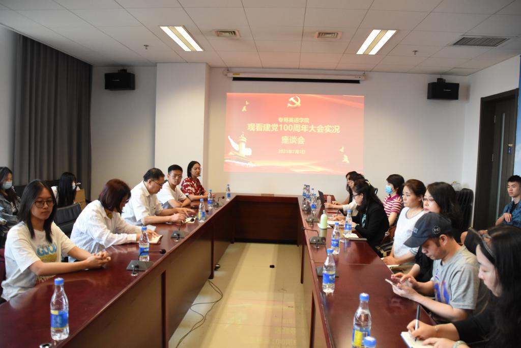 7月1日上午10点,best365网页版登录入口党总支组织全体师生党员、入党积极分子和各班学生在国际大厦礼堂集体观看了庆祝中国共产党成立100周年大会直播,并在直播后召集师生党员和同学代表共计30多人在国际大厦1016召开座谈会。座谈会由党总支书记蔡鸿主持。